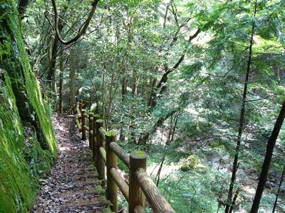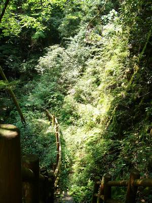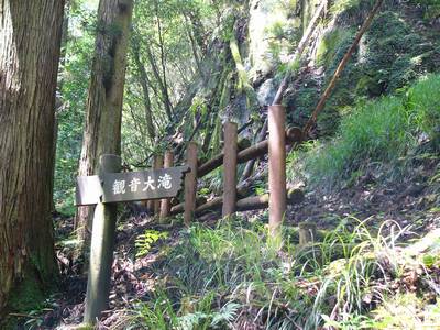 | 滝の看板が見えました(^^)ほ! | 階段の木、ところどころ腐ってます。 | |
