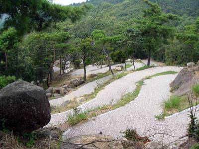 | 遊歩道・・・九十九折の道と並走してまっすぐの超急勾配の道が付いています・・どちらが楽なのだろうか(・'・;)?。 |