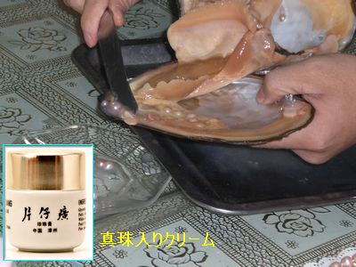 無錫の太湖にある真珠店(淡水真珠)カラス貝から真珠を取り出しの実演販売!カラス貝は一度に数十個もの真珠が取れます。真珠入りクリームまとめ買いしました、日本で買うより劇安。