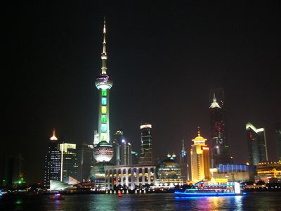 | 上海タワー(東方明珠塔)高さ468mアジア第1位、 現地時間の20時、ゆっくりしたかったのですがガイドさん「寒いからとそんなに長くいられないでしょ」と10分ほどで引き上げました(=`ェ´=)ったく!。 |